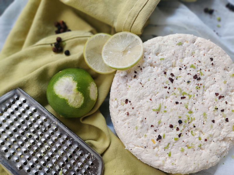 This paneer is infused with lemon rinds and freshly crushed black pepper to give it a peppy and citrusy flavour and fragrance . This paneer can be used as the best form of medium soft cheese on any cheese board or as a paneer steak, in curries or grills!!
